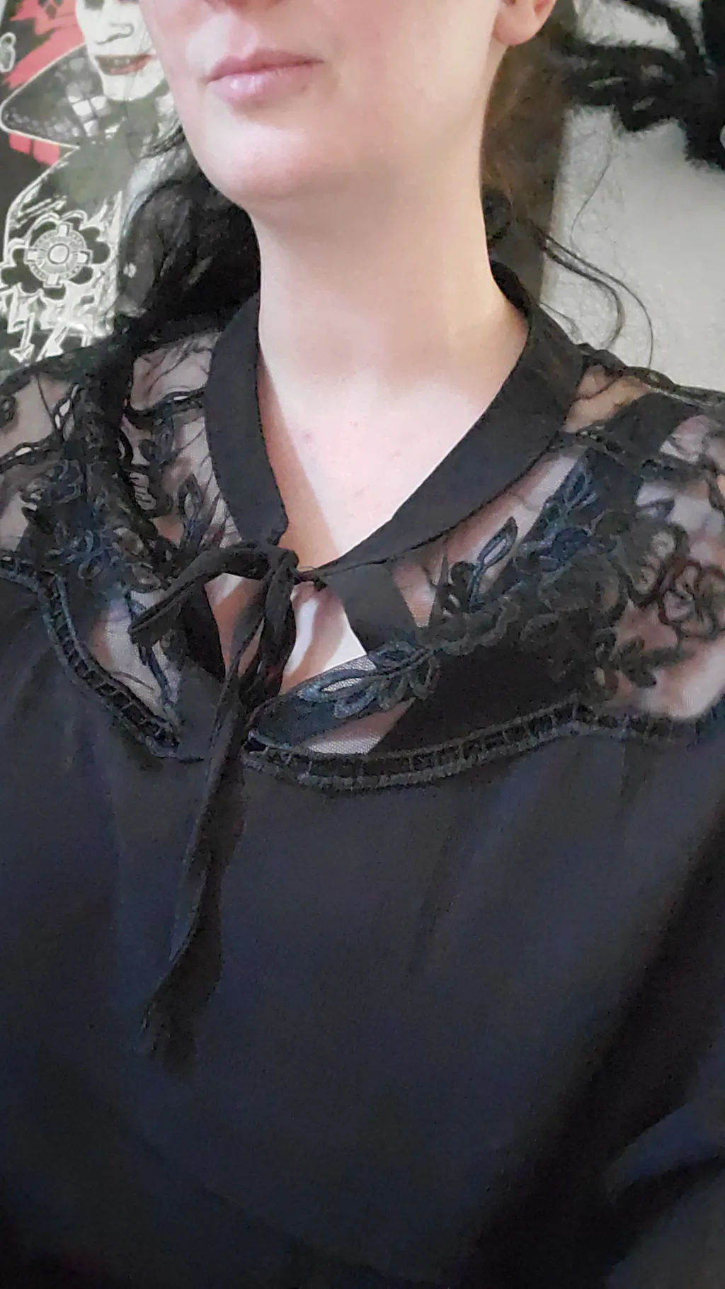 - Lace detailing on the neck and shoulders