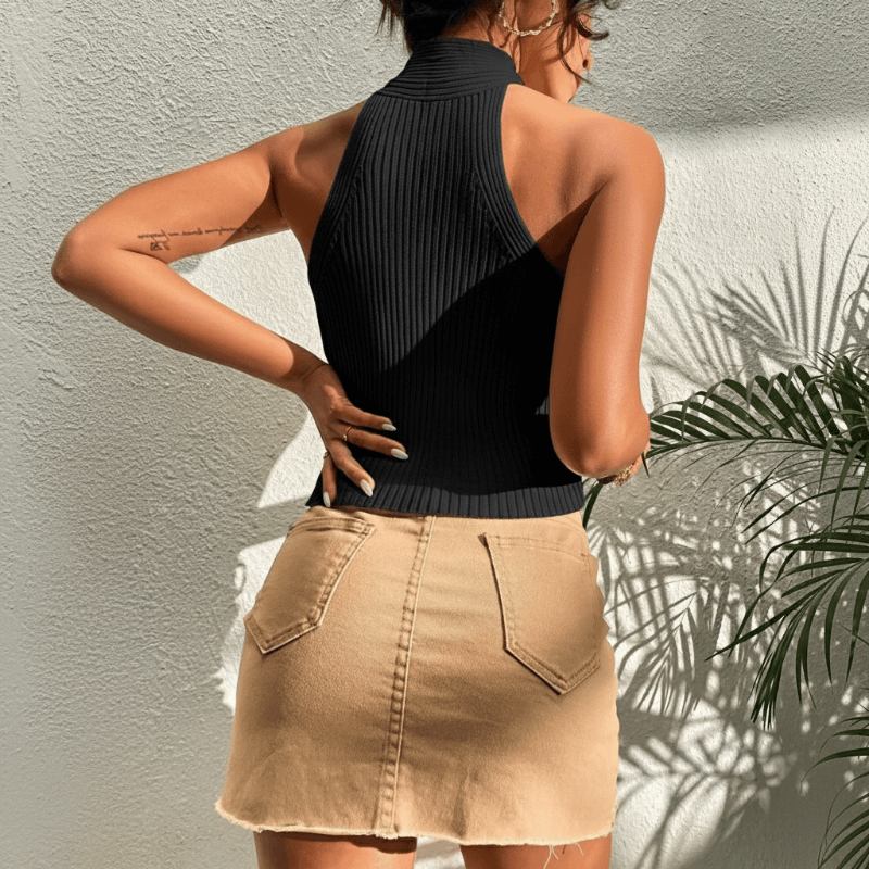 Turn heads this summer in our Criss Cross Ribbed Knit Halter Crop Top – a must-have addition to your warm-weather wardrobe. This flattering sleeveless top features a unique cross-front halter neckline with a stylish keyhole cutout, adding a flirty twist to a classic ribbed design.