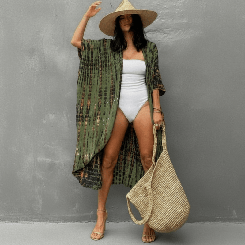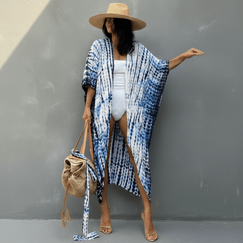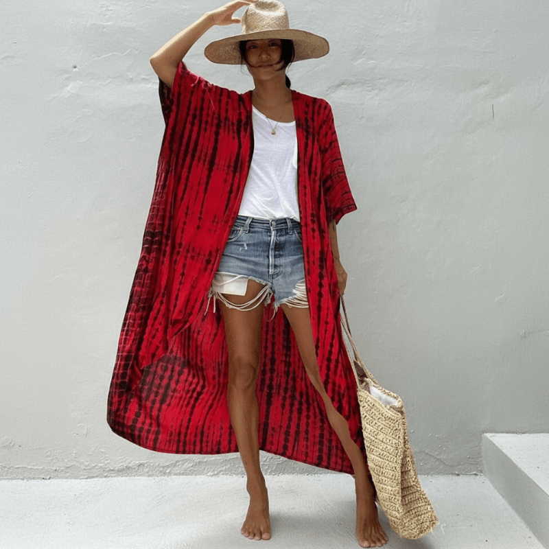 Beach season isn't complete without our Long Kimono Swimsuit Cover Up. This beautiful boho kimono adds a stylish and unique touch to any beach look. It features a vibrant tie dye print and is made of lightweight cotton material, making it perfect to wear over your swimsuit while enjoying time in the sun. The comfortable drawstring waist ensures a flattering fit on every body type. Whether you're headed to the pool or beach, this kimono cover up will provide you with style and comfort all day long!